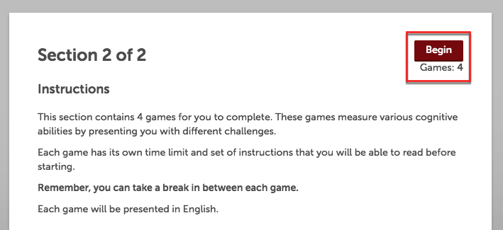 - Прежде чем приступить к разделу, вы увидите количество игр в нем и правила. Нажмите Begin (Приступить), чтобы перейти к играм.